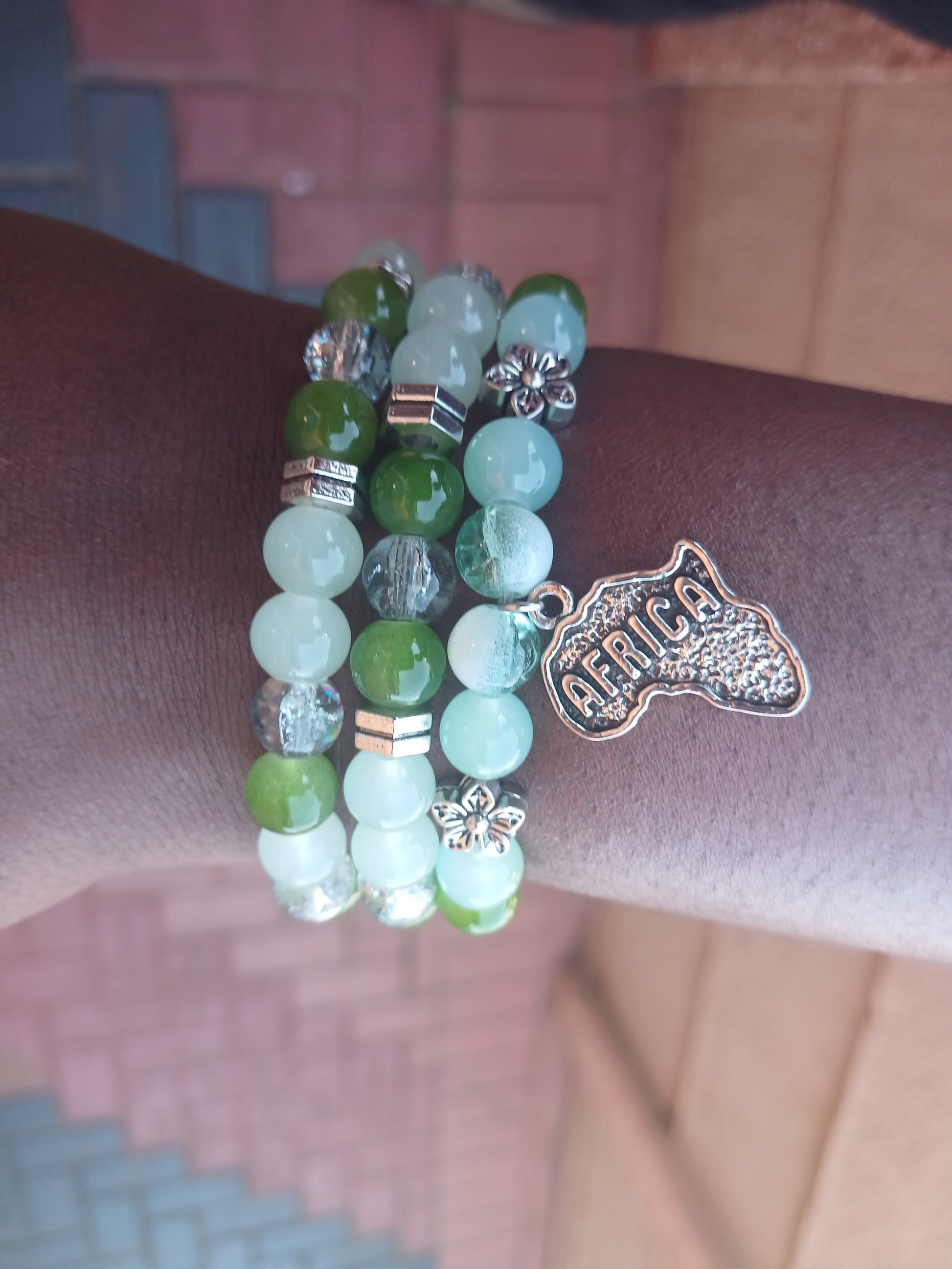Embrace the vibrant spirit of nature with our Radiant Forest Trio. This captivating set of three bracelets features lush green hues, reminiscent of serene forests and landscapes. Each piece is designed to bring a touch of earthy elegance and natural beauty to your wrist. Adorned with a distinctive charm of Africa, this trio celebrates the continent's rich heritage and timeless allure. Wear them individually for a subtle pop of color or stack them to create a harmonious, layered look that truly radiates sophistication and connection to the wild.