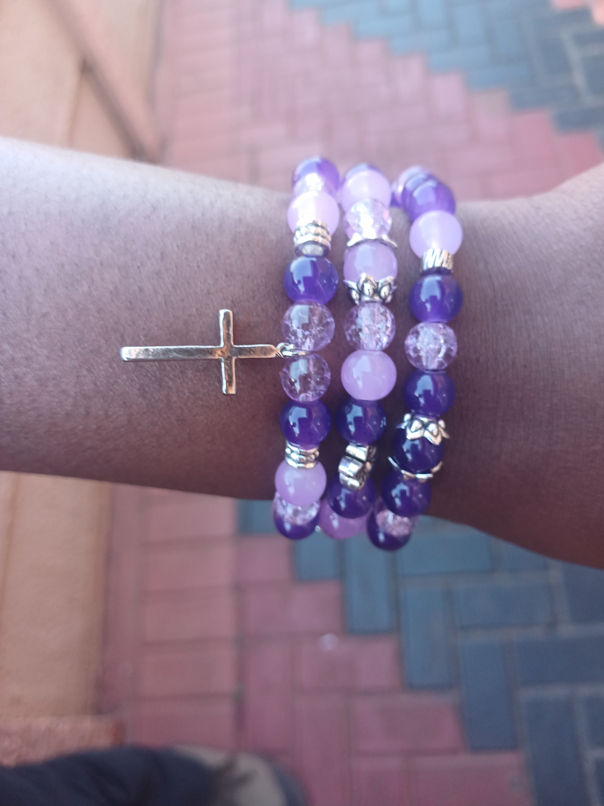 Embrace the enchanting allure of our Radiant Violet Bloom Trio. This exquisite set of three glass beaded bracelets captures the deep, captivating hues of a blossoming violet garden. Each piece is designed to bring a touch of regal elegance and serene beauty to your wrist, reflecting light with every movement. Adorned with a special "Cross" charm, this trio serves as a gentle reminder of faith, hope, and divine grace. Wear them individually for a subtle pop of color or stack them to create a rich, layered look that truly radiates sophistication and spiritual peace.